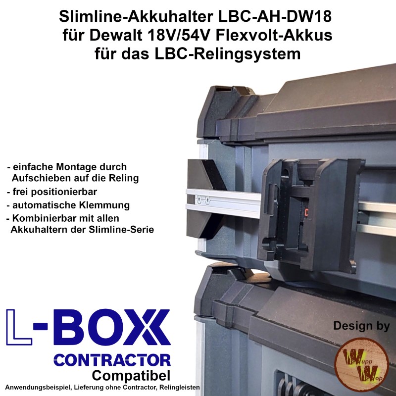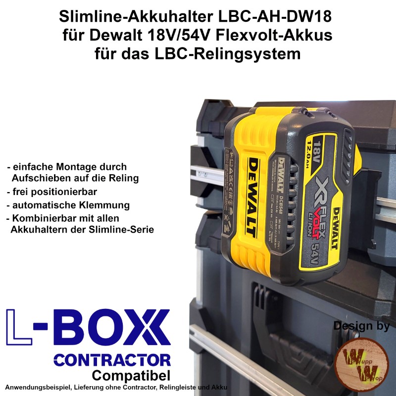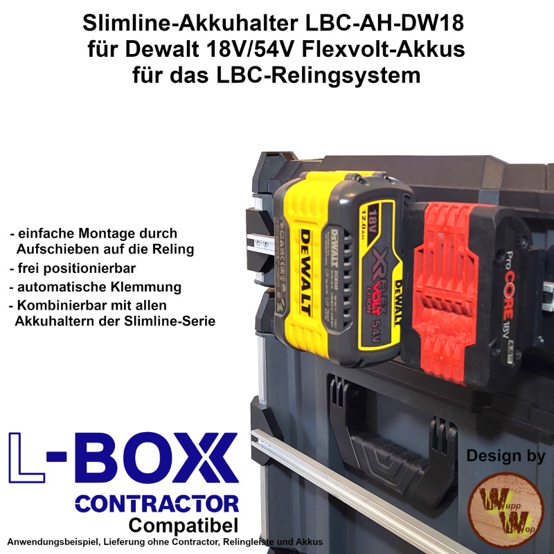 Akkuhalter DeWalt 18V / 54V FlexVolt LBC-AH-DW18 – Akkus organisiert an der L-Boxx Contractor