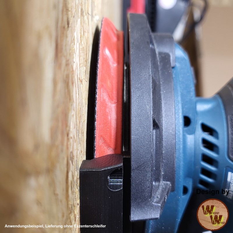Er stützt die Maschine über Gehäuse und Tellerrand ab – nicht über die Schleiffläche. So entstehen keine Druckstellen, die Schleifplatte bleibt in Form und der Klettbelag wird geschont.